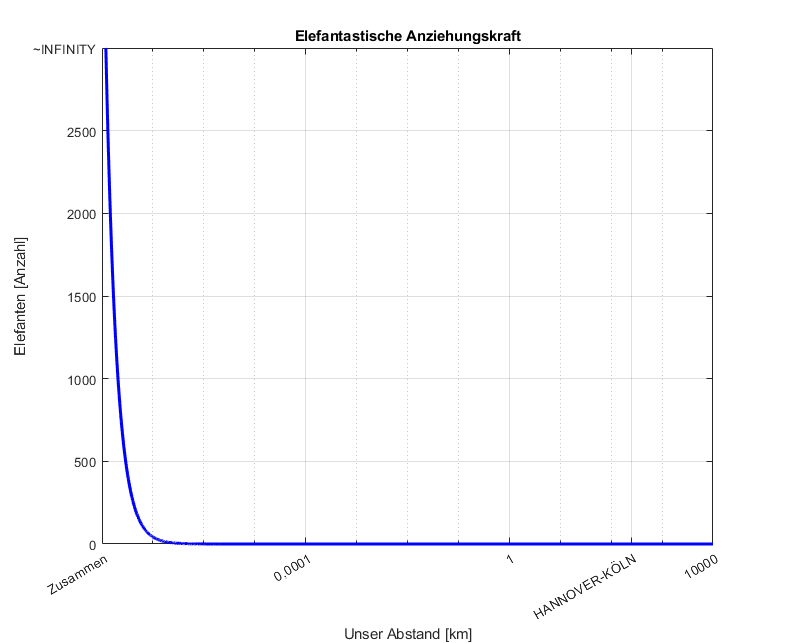 Auf der X-Achse ist der Abstand zwischen uns in Kilometern definiert, beginnend mit dem kleinsten Abstand ganz links und immergrößer werdendem Abstand nach rechts. Die Y-Achse zeigt an wie viele Elefanten es braucht um uns beide ausseinander zu ziehen.