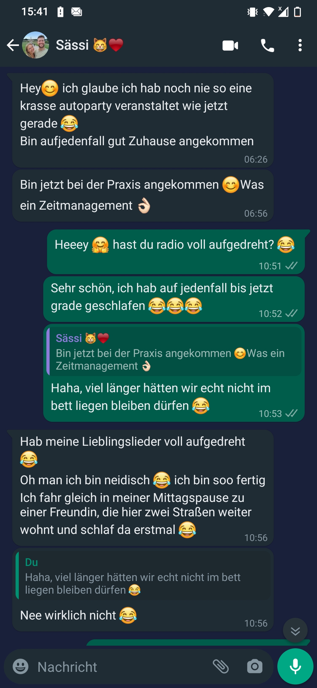 Sässi, ich liebe dich, weil du immer ehrlich bist und mich nicht anlügen kannst...selbst wenn du es versuchst, und mir dabei sogar noch in die Augen schaußt, fängst spätestens nach 2 Sekunden an zu krinsen und zu lachen 😅🥰 Ich weiß bei dir einfach immer das du bei den wichtigen Dingen genauso Denkst wie ich!